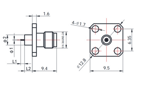 Gwave provide a group of 2.92mm Female Flange Mount and Metal through-plate connectors, using frequency up to 40GHz. This series of connectors have 4-Hole flange, flange size is 9.5mmX 9.5mm and the space of flange hole is 6.35mm . They have different Through-plate matel diameter and length, different tail Pin diameter and Length. Please refer to the picture, drawing and the corresponding size to select the product you need.