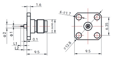 2.92mm Female Connector with 4-hole Flange | Hole Spacing 6.35mm | Metal Through-plate | DC-40GHz