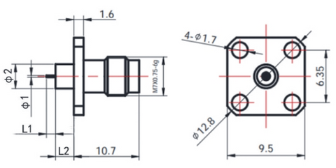 Gwave provide a group of 2.4mm Female Flange Mount and Metal through-plate connectors, using frequency up to 50GHz. This series of connectors have 4-Hole flange, flange size is 9.5mmX 9.5mm and the space of flange hole is 6.35mm . They have different Through-plate matel diameter and length, different tail Pin diameter and Length. Please refer to the picture, drawing and the corresponding size to select the product you need.