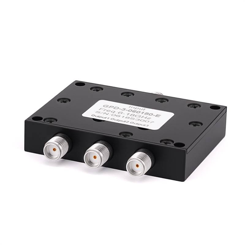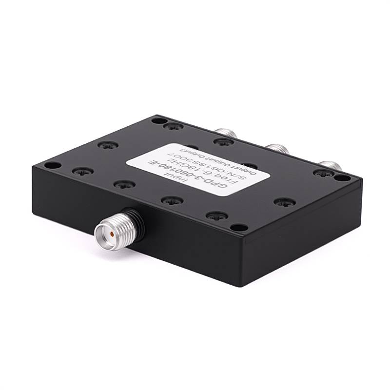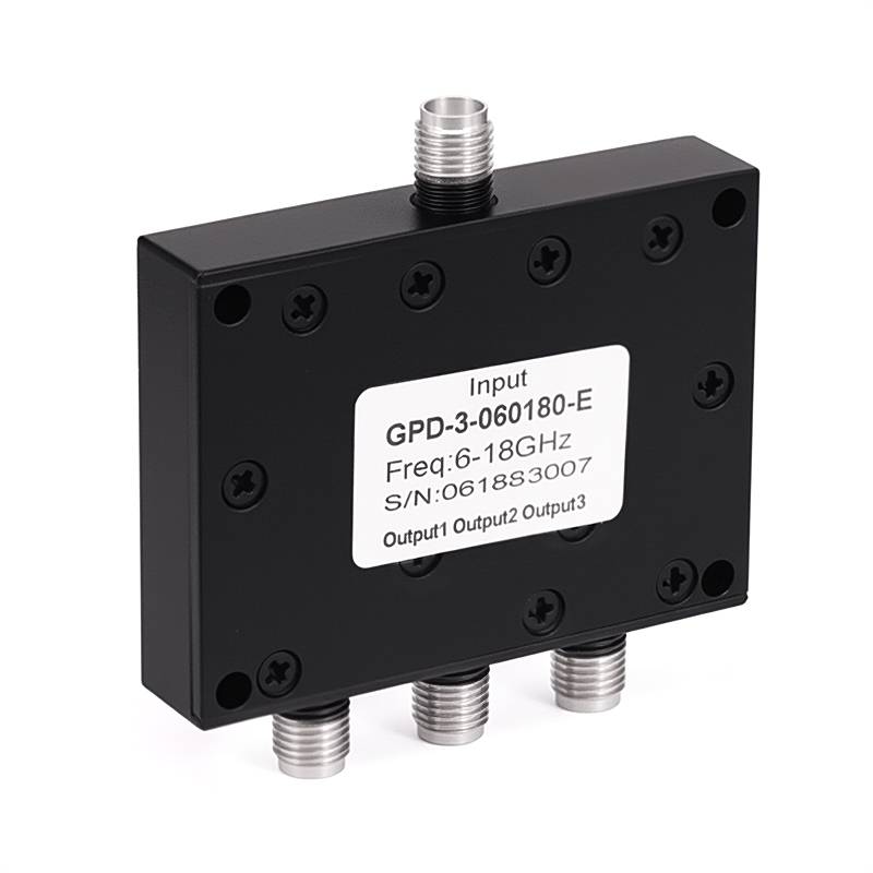 GPD-3-060180-E is a 3-Way SMA Power Divider From 6 GHz to 18 GHz Rated at 20 Watts coaxial power divider that covers the frequency range from 6-18GHz. This power divider has a Aluminum housing material and ensures an excellent microwave performance with low insertion loss and VSWR of .This power divider is precisely manufactured to RF industries like military & space, RF communication, test & measurement and industrial applications..