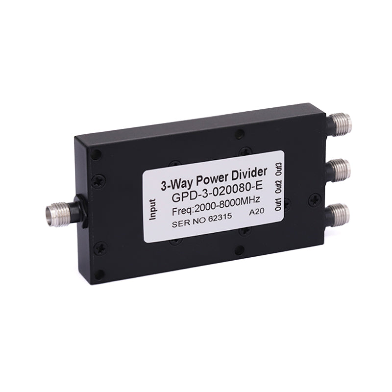 GPD-3-02080-E is a 3-Way SMA Power Divider From 2 GHz to 8 GHz Rated at 20 Watts coaxial power divider that covers the frequency range from 4-8GHz. This power divider has a Aluminum housing material and ensures an excellent microwave performance with low insertion loss and VSWR of .This power divider is precisely manufactured to RF industries like military & space, RF communication, test & measurement and industrial applications..