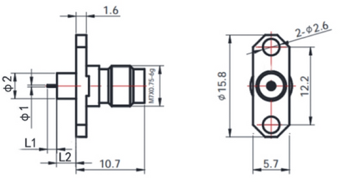 Gwave provide a group of 2.4mm Female Flange Mount and Metal through-plate connectors, using frequency up to 50GHz. This series of connectors have 2-Hole flange, flange size is 15.8mmX 5.7mm and the space of flange hole is 12.2mm . They have different Through-plate matel diameter and length, different tail Pin diameter and Length. Please refer to the picture, drawing and the corresponding size to select the product you need.