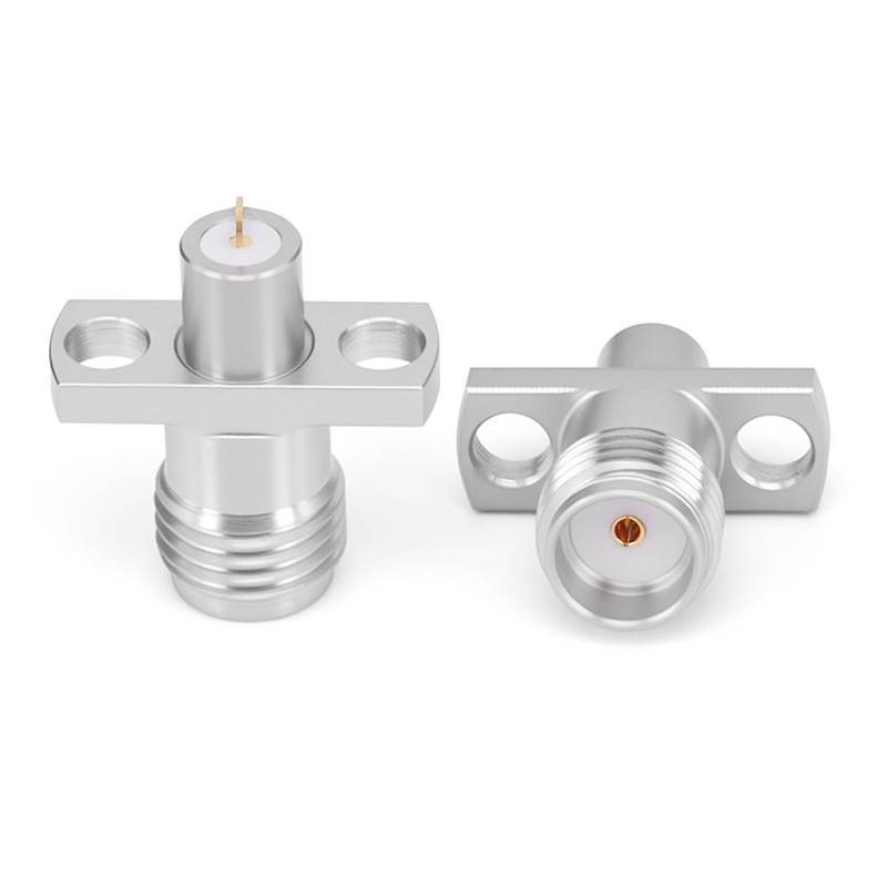 SMA Female Panel Mount Connector | 2 Hole Flange | Hole Spacing 8.9mm | Metal Feedthrough | Metal Core (4mm Dia x 4mm Length) | Flat PCB Pin (0.8mm Dia x 1.5mm Length 0.2mm Thickness) | Vertical Mount | DC -26.5 GHz